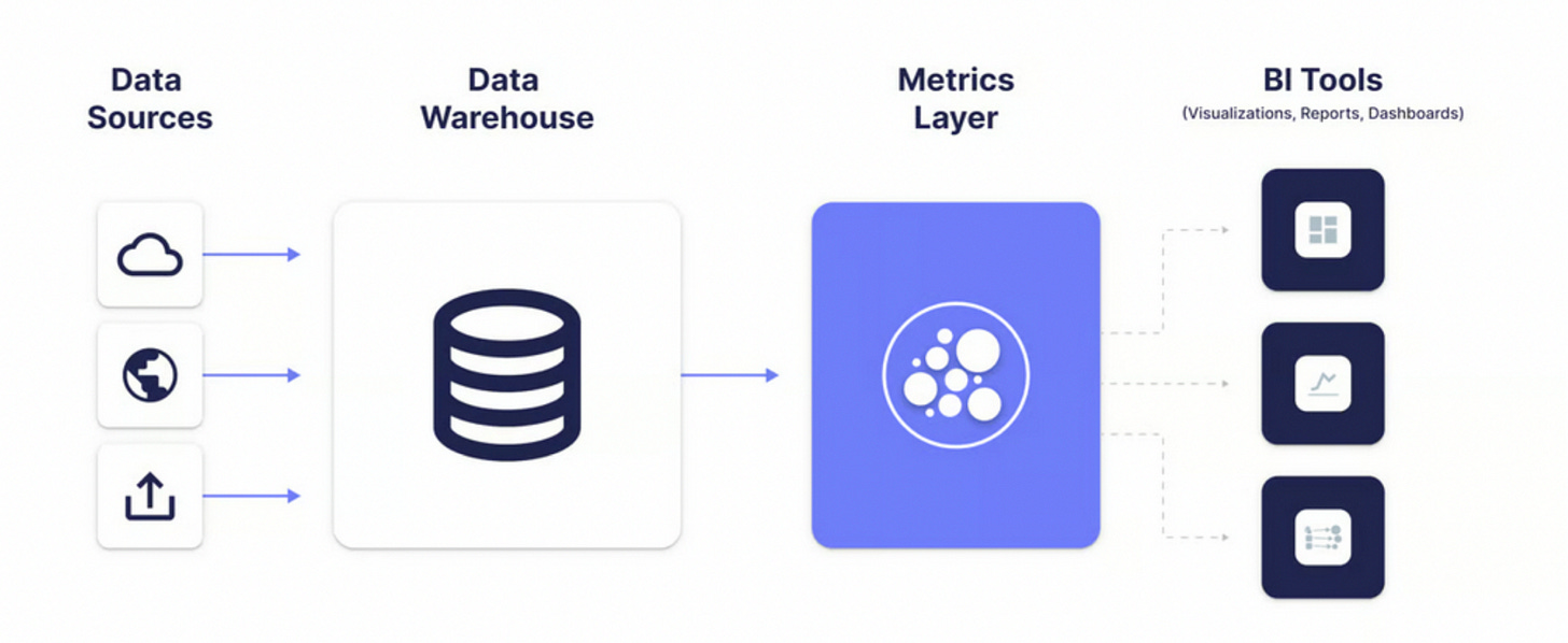 For a BI tool to be effective (and well-adopted), end users need to be 100% confident in the data. Business users may not have the technical expertise (or the time) to understand the complexities of the data’s structure. They just need to know that it’s reliable and consistent. Their data has to reflect the same values for the same metric company wide. This leads us to a crucial point – everyone must operate based on the same metric, thus a metric should be unique. This is where the semantic layer (at Klipfolio we often refer to it as a metrics layer) comes into play. As an integral part of the modern data stack, the semantic layer approach has gained popularity in recent years, and for good reasons. The semantic layer abstracts the business logic from raw data and sits between data sources and the visualization layer. It becomes the metric's single source of truth and comprises the metric name, the definition, the formula and aggregation method, and the instructions on where to query the data.