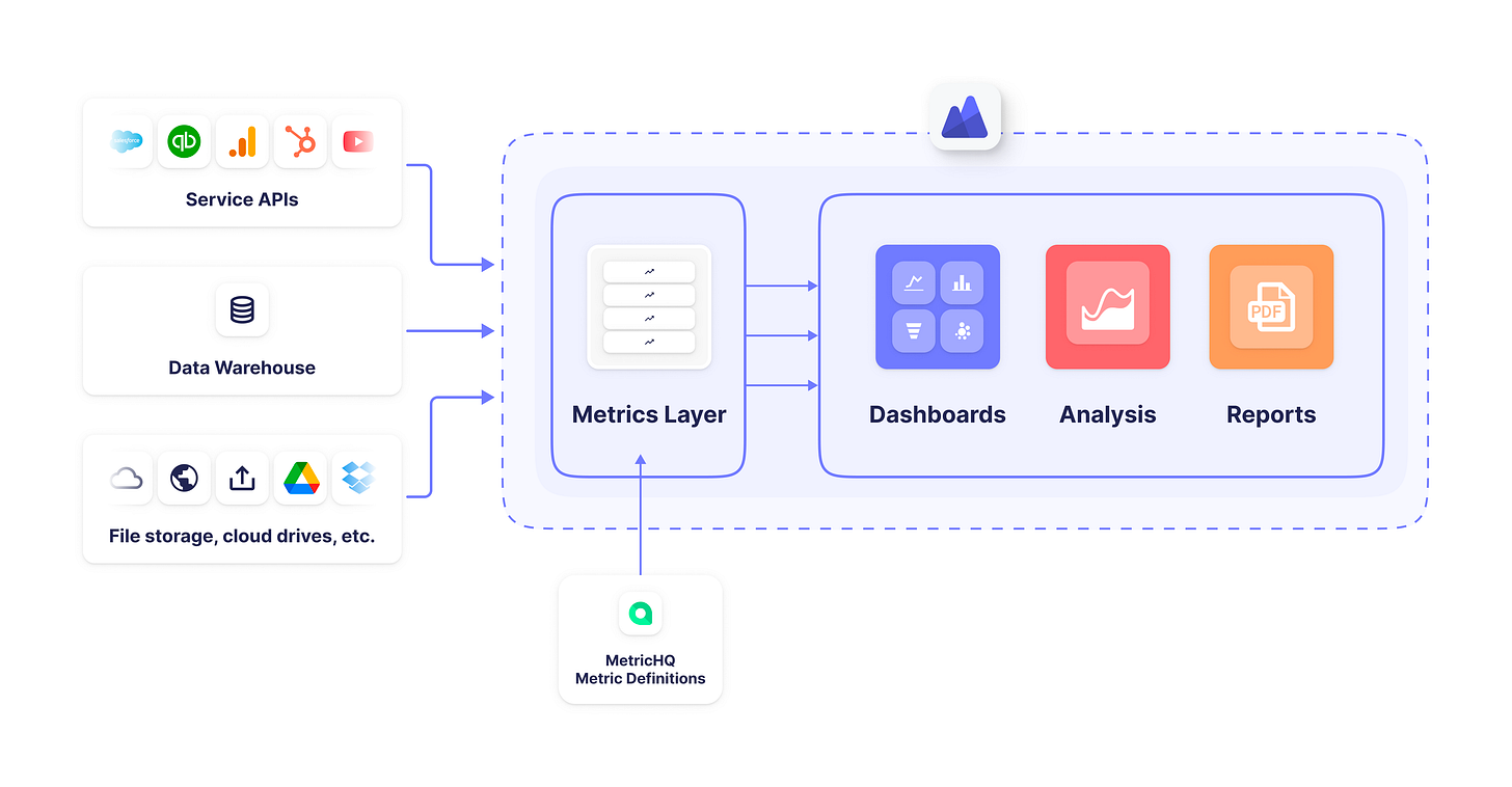 A metrics layer is a separate but integrated layer within the modern data stack:
